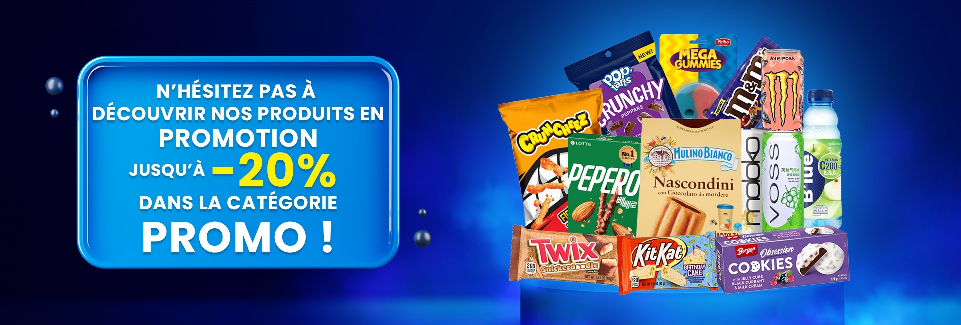 Plusieurs catégories de produits dont des boissons, des snacks sucrés & salés